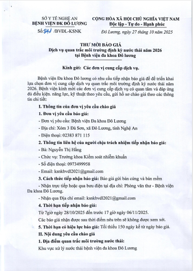 Bệnh viện đa khoa Đô Lương thông báo thư mời báo giá dich vụ quan trắc môi trường định kỳ nước thải năm 2026 như sau: