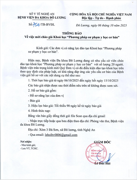 Bệnh viện đa khoa Đô Lương thông báo về việc mời chào giá khóa học " Phương pháp sư phạm y học cơ bản"