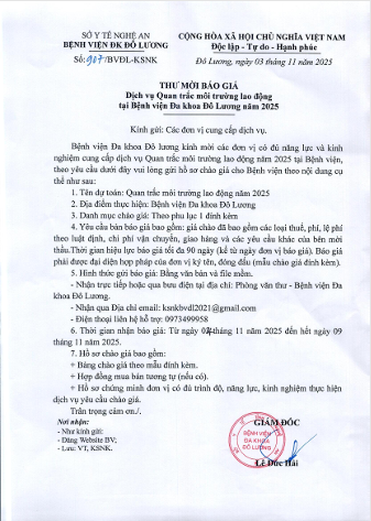 Bệnh viện đa khoa Đô Lương thông báo thư mời báo giá dịch vụ quan trắc môi trường lao động tại bệnh viện năm 2025.